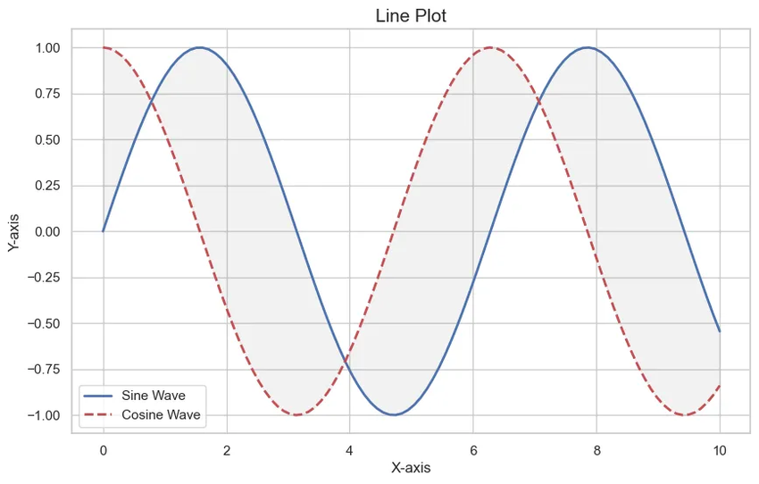 # 添加装饰plt.fill_between(x, y1, y2, color="gray", alpha=0.1)plt.title("Line Plot", fontsize=15)plt.xlabel("X-axis", fontsize=12)plt.ylabel("Y-axis", fontsize=12)plt.legend()plt.show()